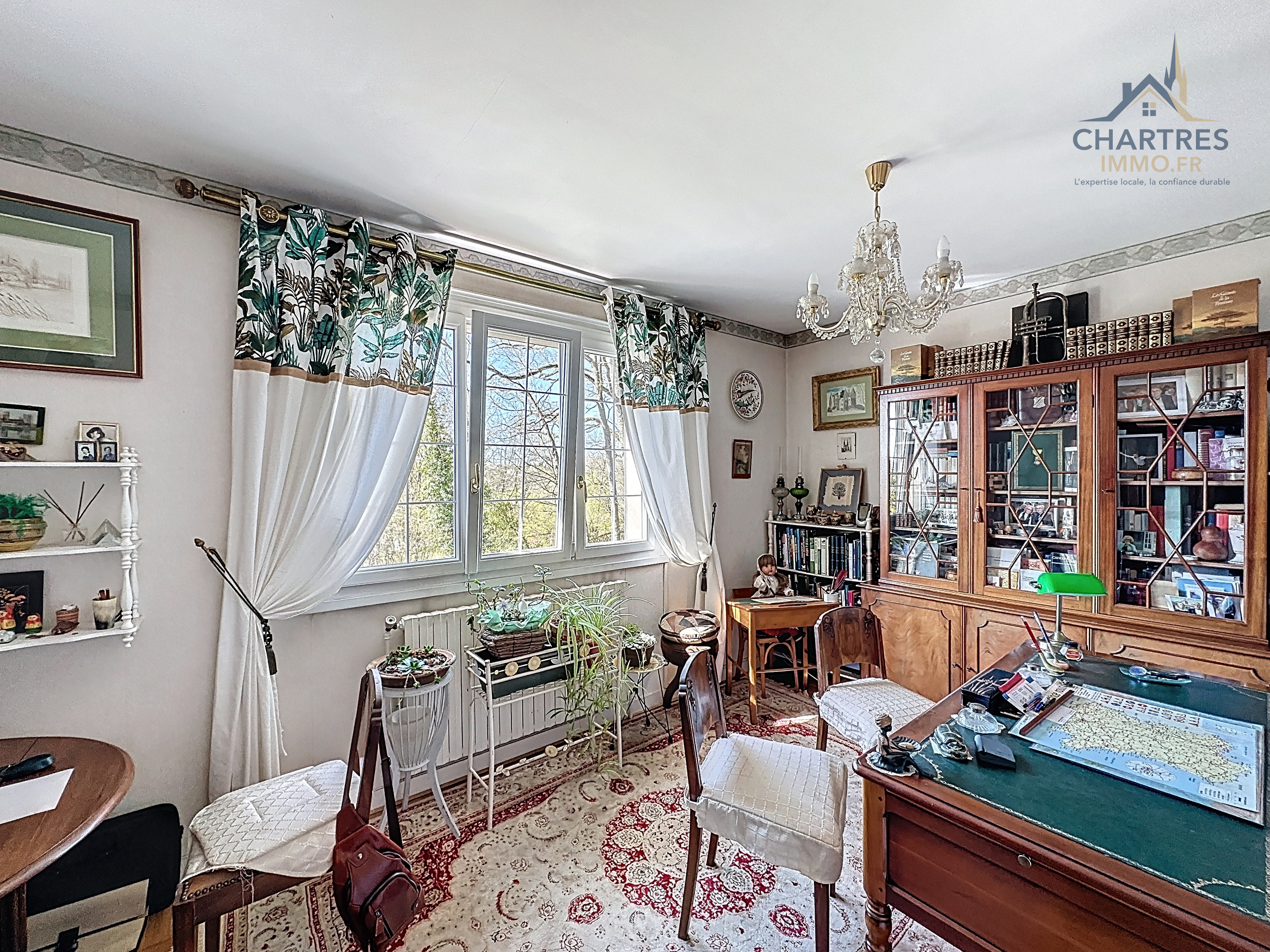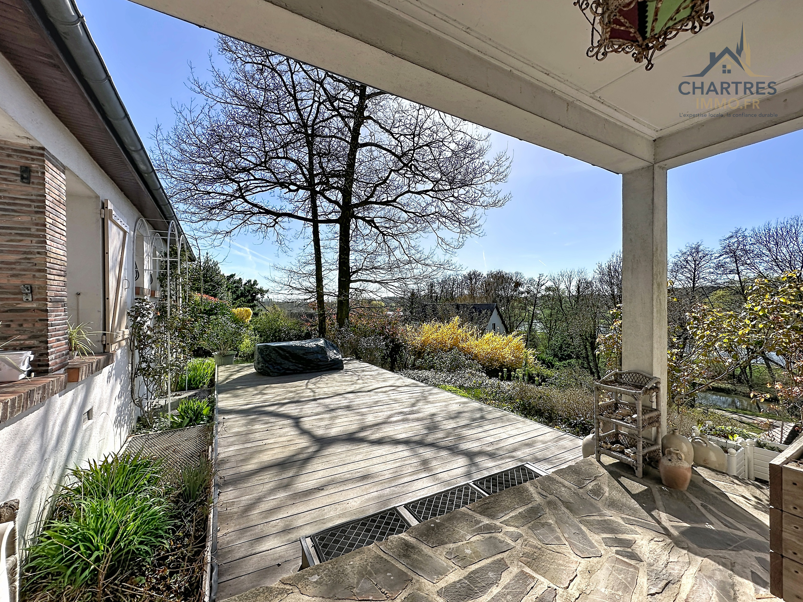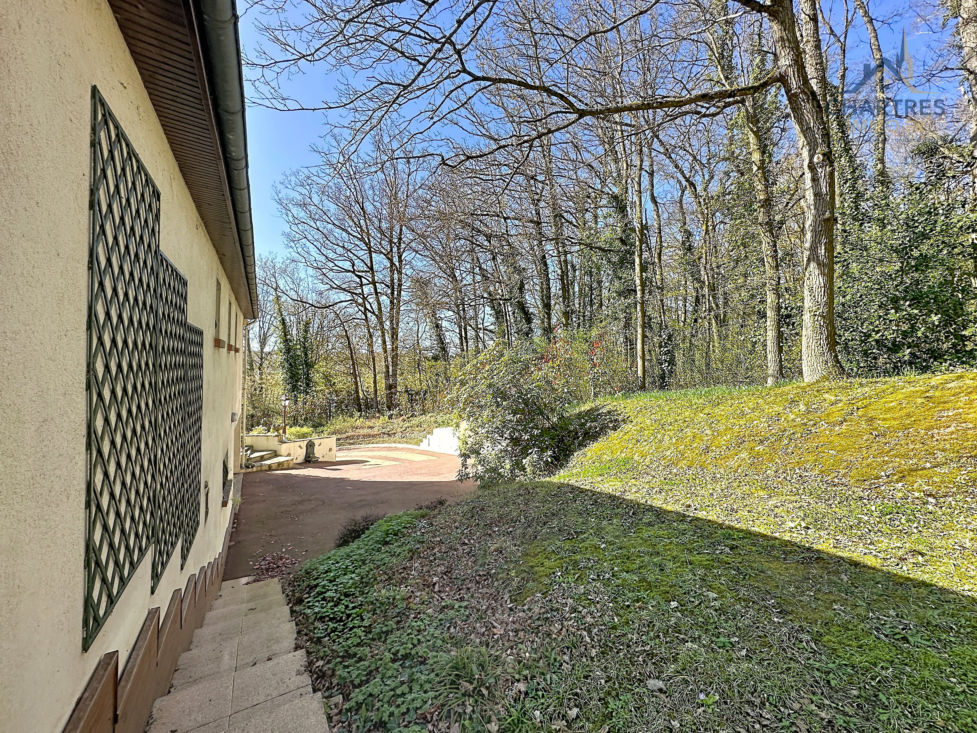 À l’extérieur, le terrain clos, arboré et boisé de 2 700 m² change immédiatement la perception du lieu. Il apporte une respiration rare si près de la ville, renforce l’intimité et donne à cette maison avec grand terrain au calme près de Chartres une vraie dimension patrimoniale. Les deux terrasses prolongent naturellement la maison : l’une profite de la vue dominante, l’autre s’oriente vers la partie boisée pour des moments plus confidentiels.