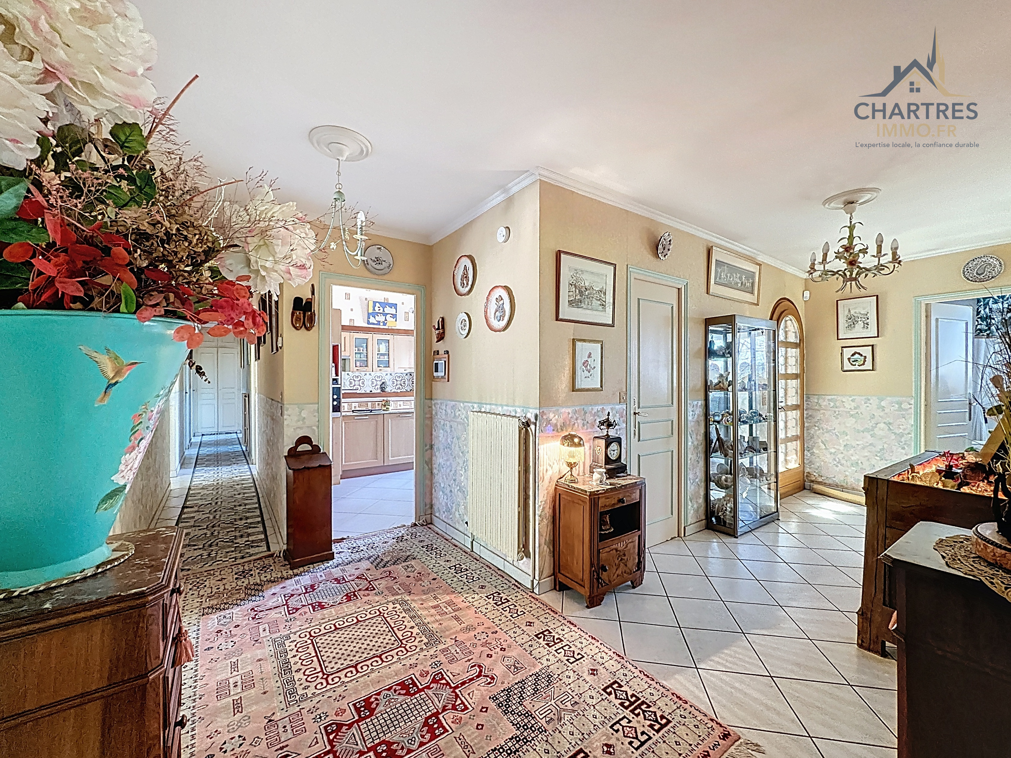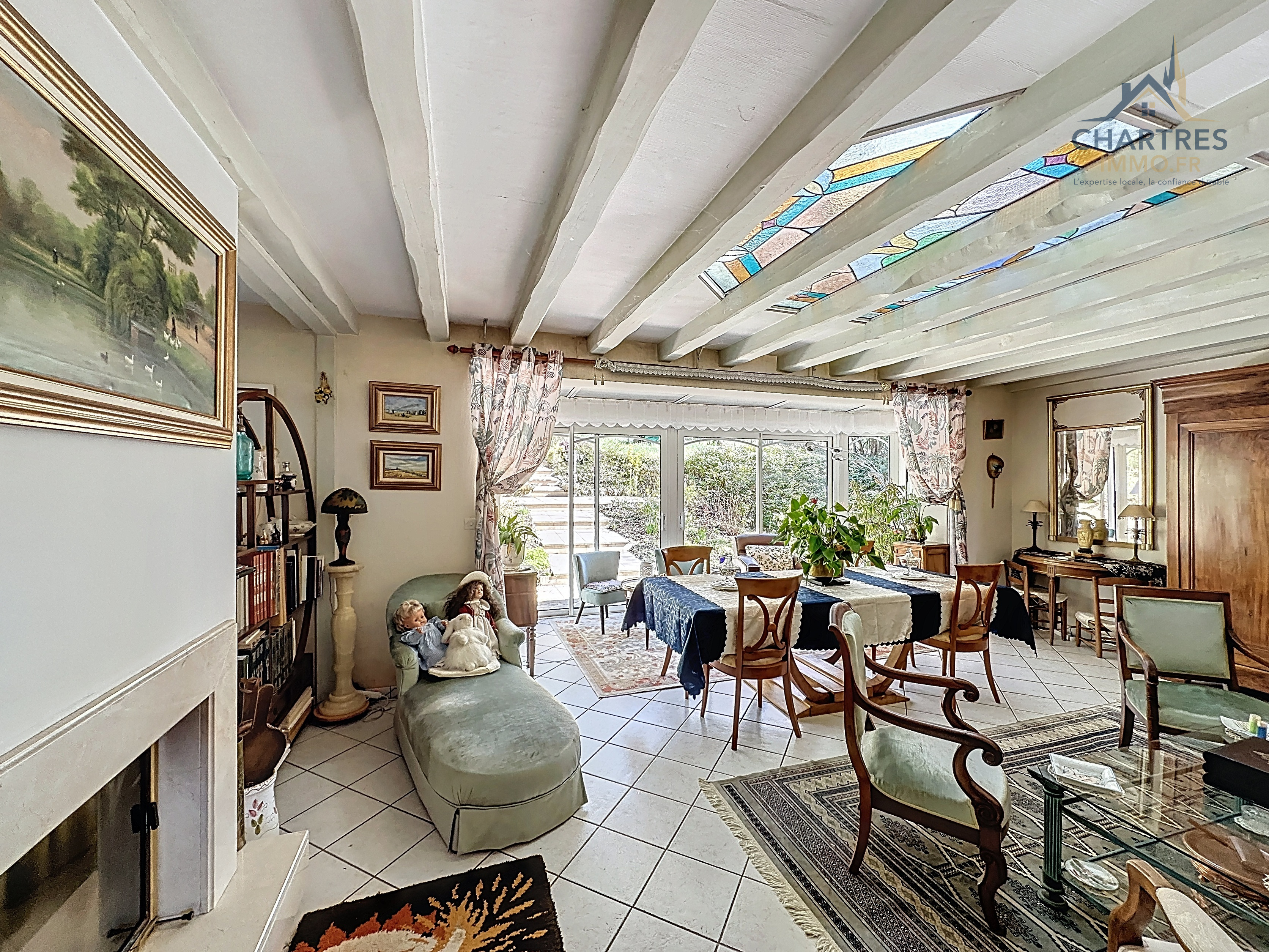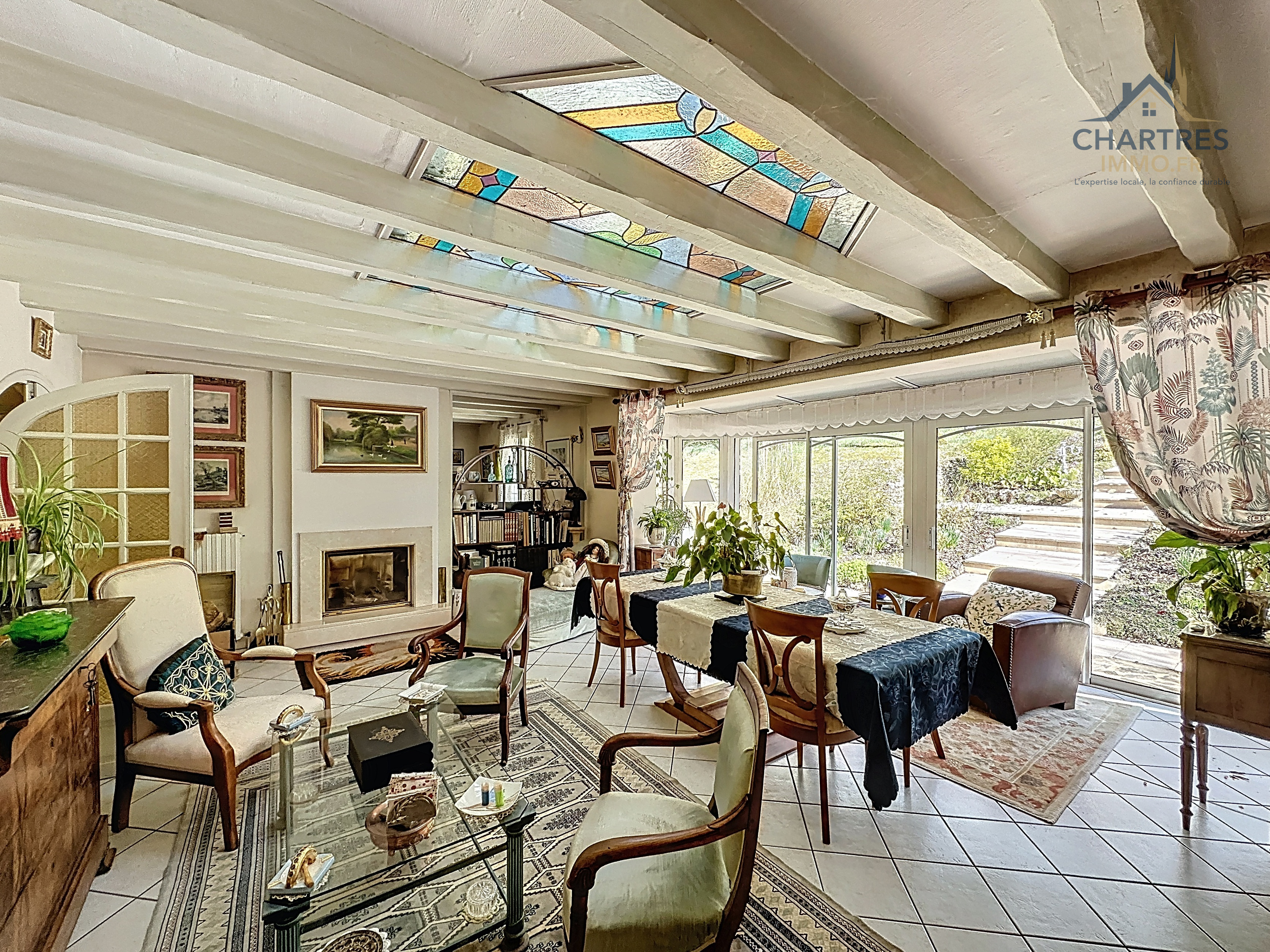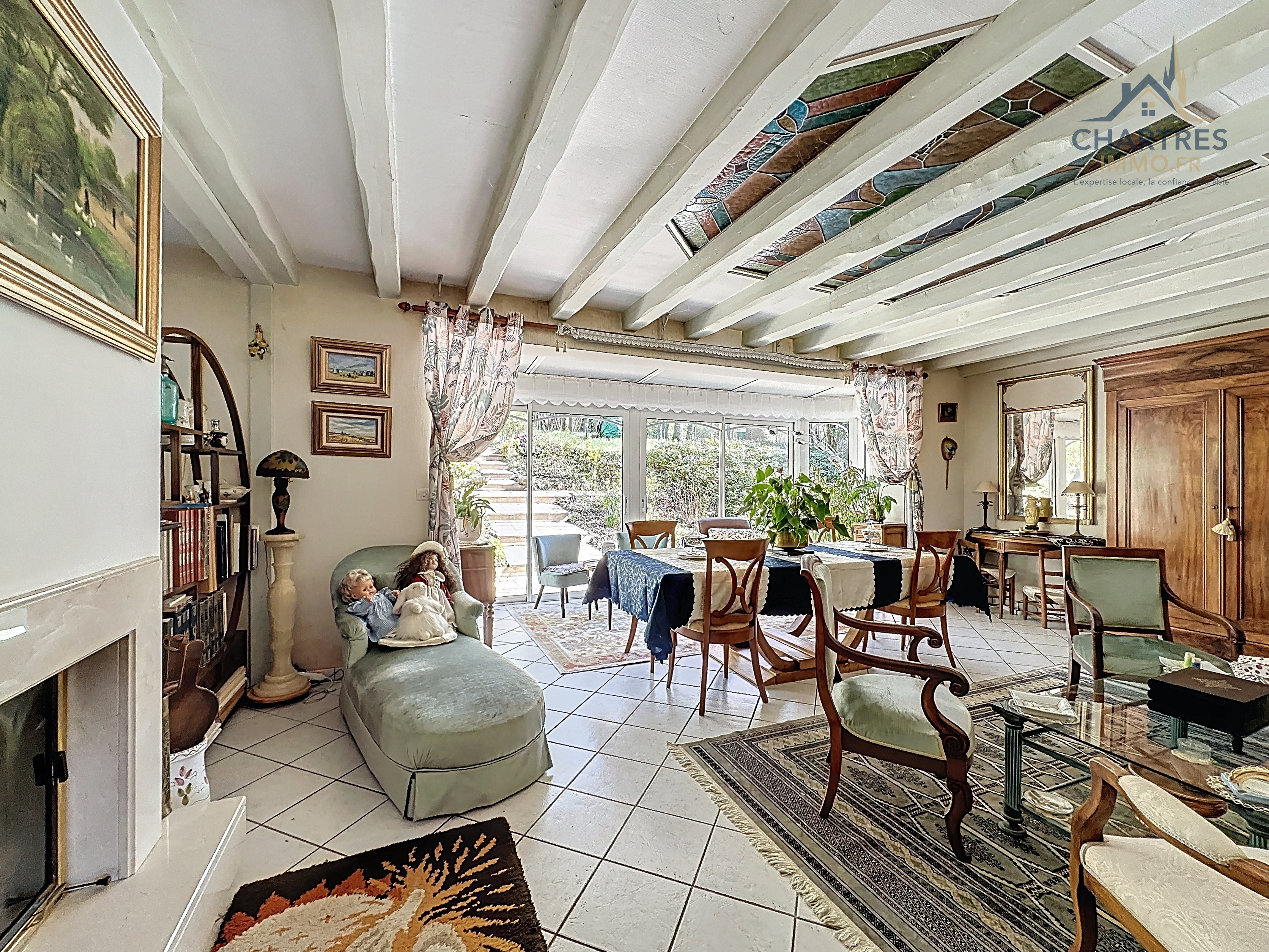 À l’extérieur, le terrain clos, arboré et boisé de 2 700 m² change immédiatement la perception du lieu. Il apporte une respiration rare si près de la ville, renforce l’intimité et donne à cette maison avec grand terrain au calme près de Chartres une vraie dimension patrimoniale. Les deux terrasses prolongent naturellement la maison : l’une profite de la vue dominante, l’autre s’oriente vers la partie boisée pour des moments plus confidentiels.