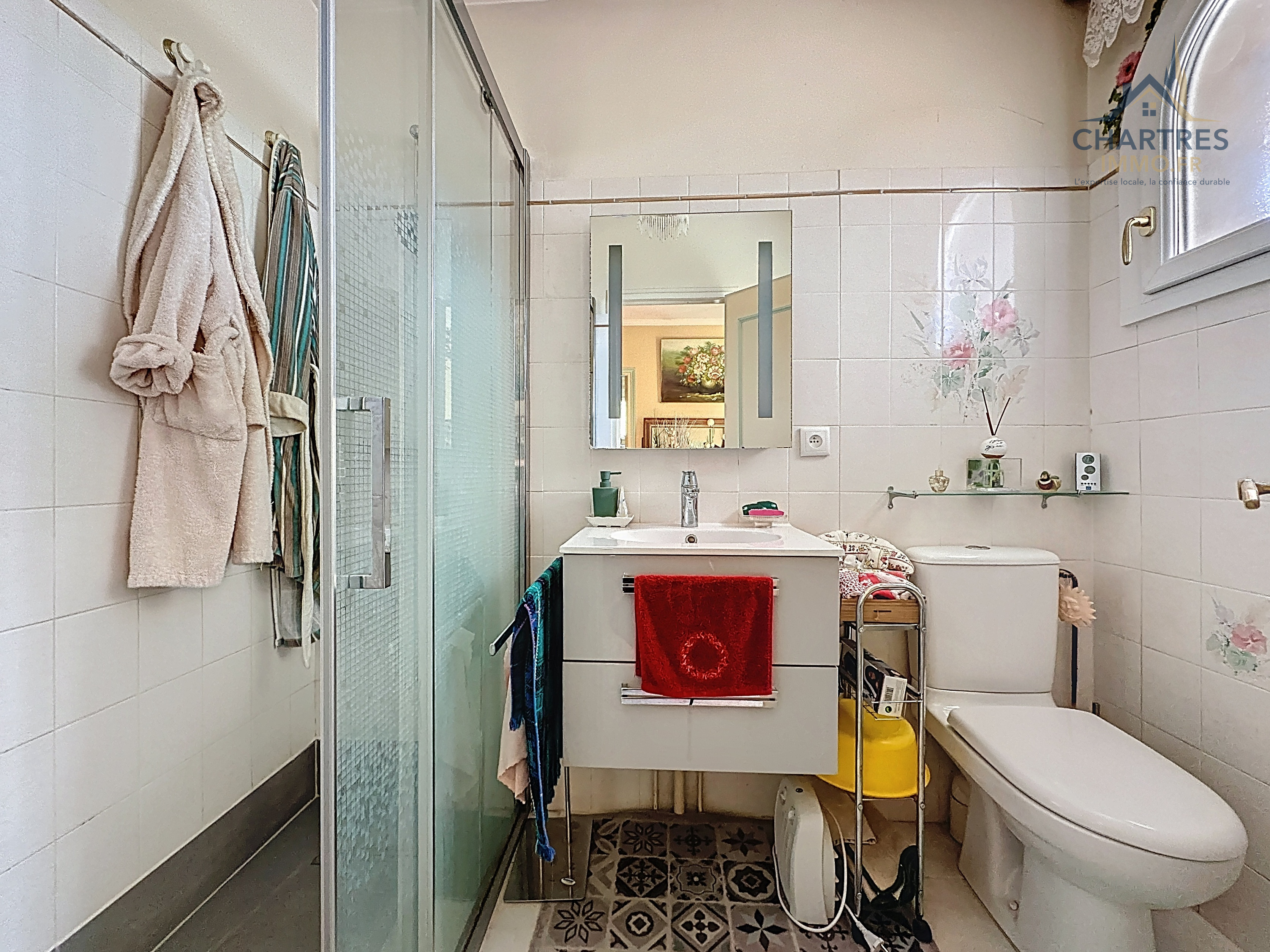La salle de bain avec baignoire et doubles vasques, la salle d’eau supplémentaire avec WC ainsi qu’un second WC indépendant apportent un confort concret dans la vie quotidienne, en particulier pour une famille recherchant un bien pratique et rassurant sur le long terme.