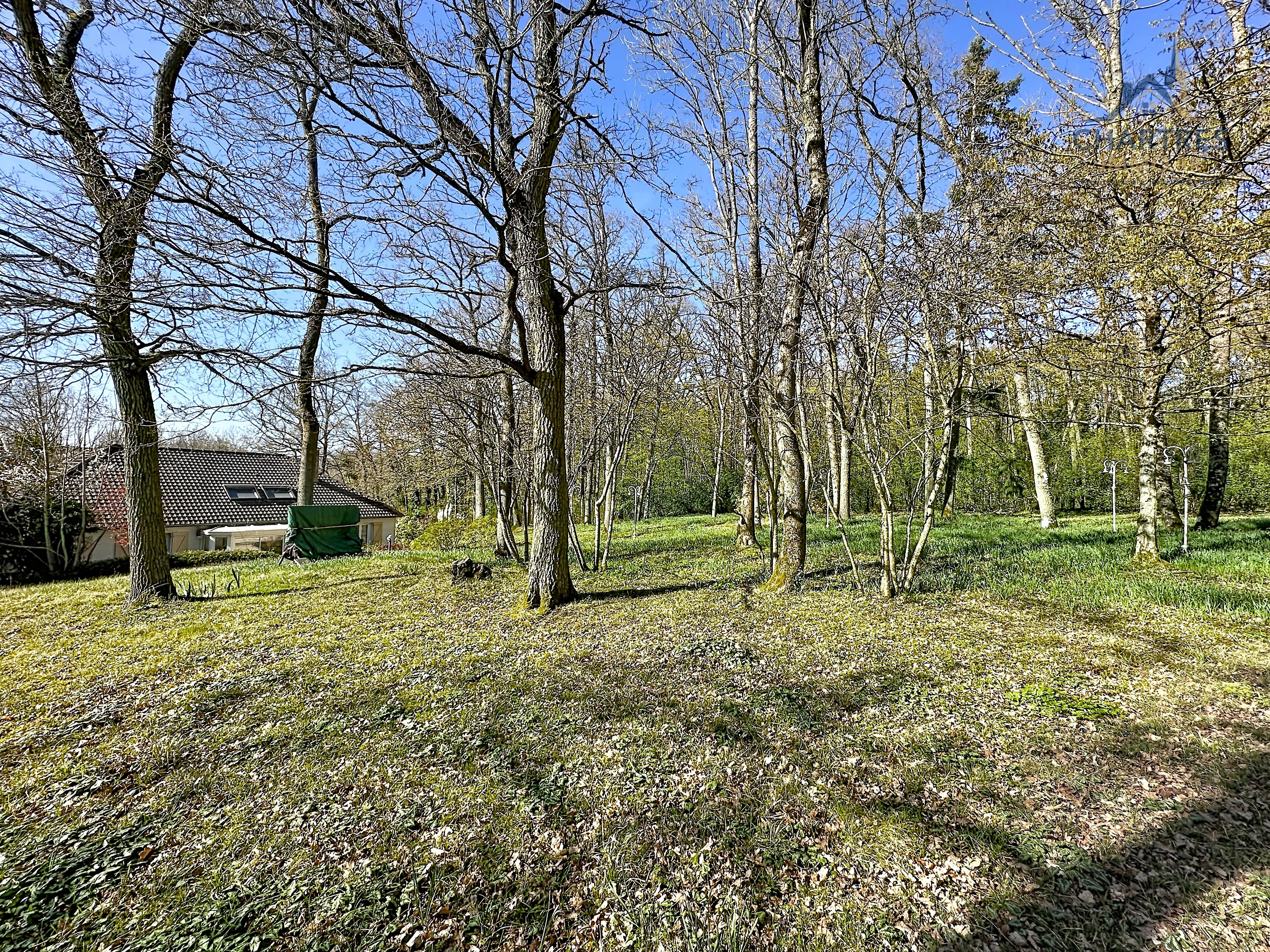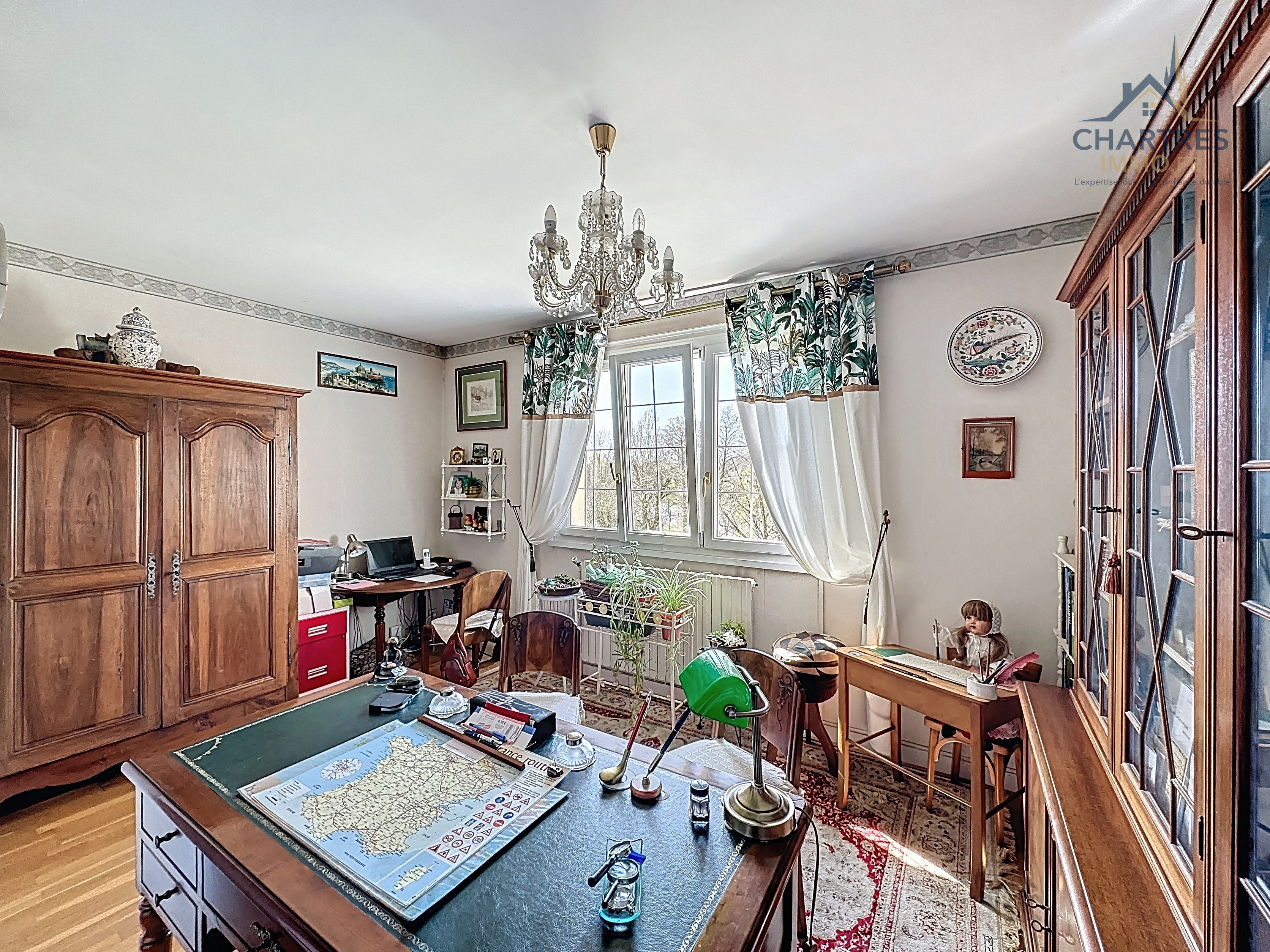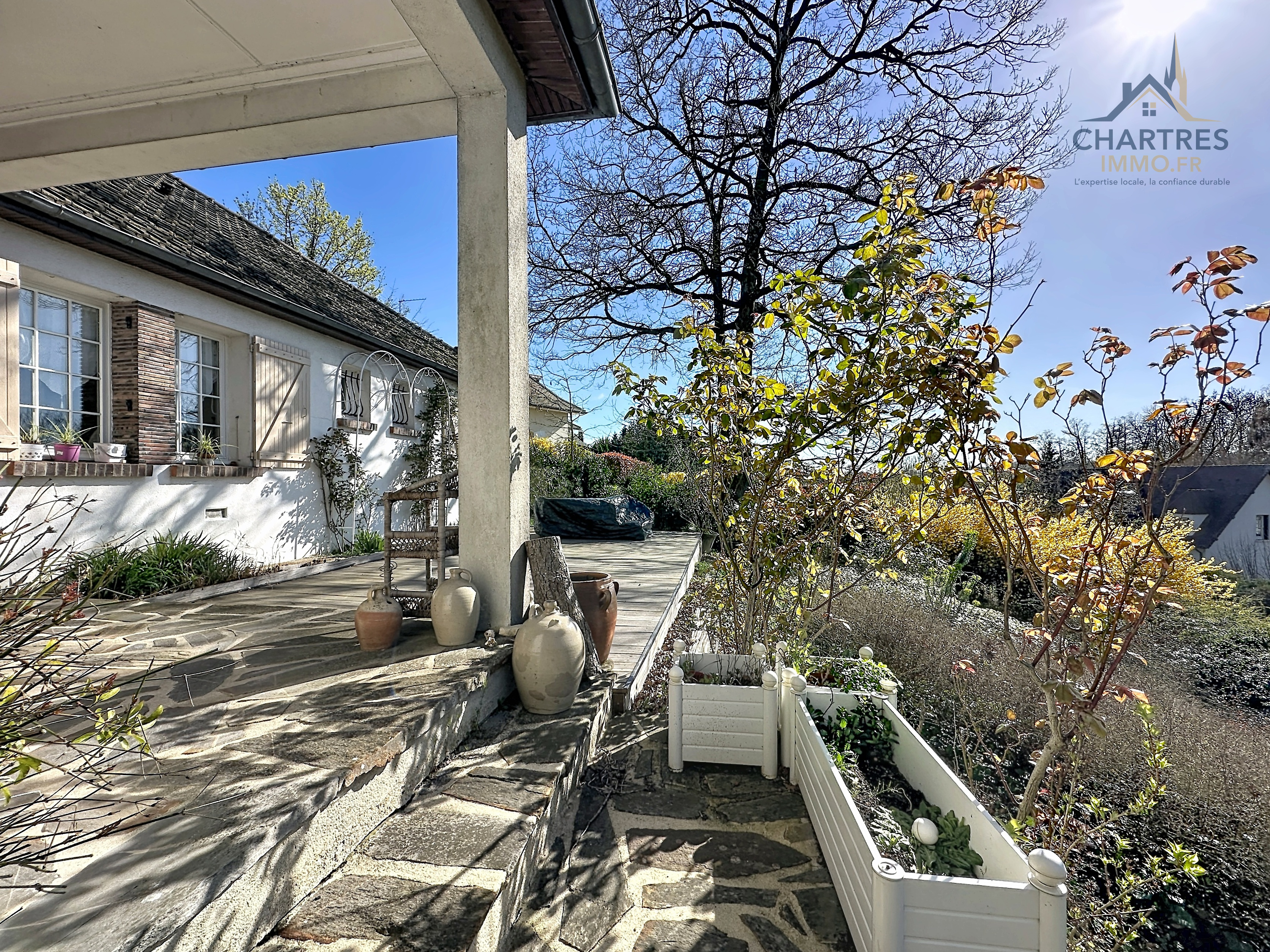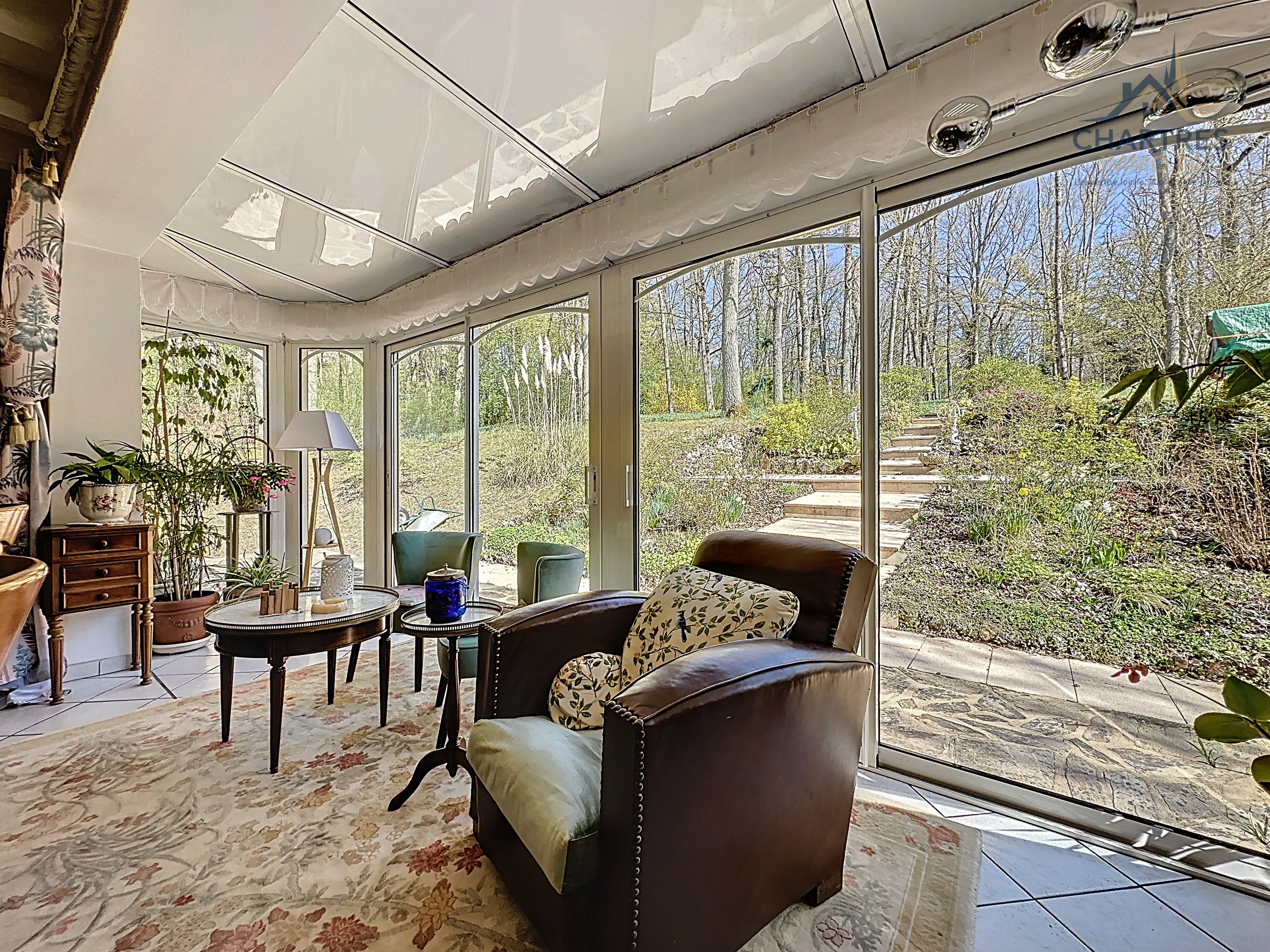 À l’extérieur, le terrain clos, arboré et boisé de 2 700 m² change immédiatement la perception du lieu. Il apporte une respiration rare si près de la ville, renforce l’intimité et donne à cette maison avec grand terrain au calme près de Chartres une vraie dimension patrimoniale. Les deux terrasses prolongent naturellement la maison : l’une profite de la vue dominante, l’autre s’oriente vers la partie boisée pour des moments plus confidentiels.