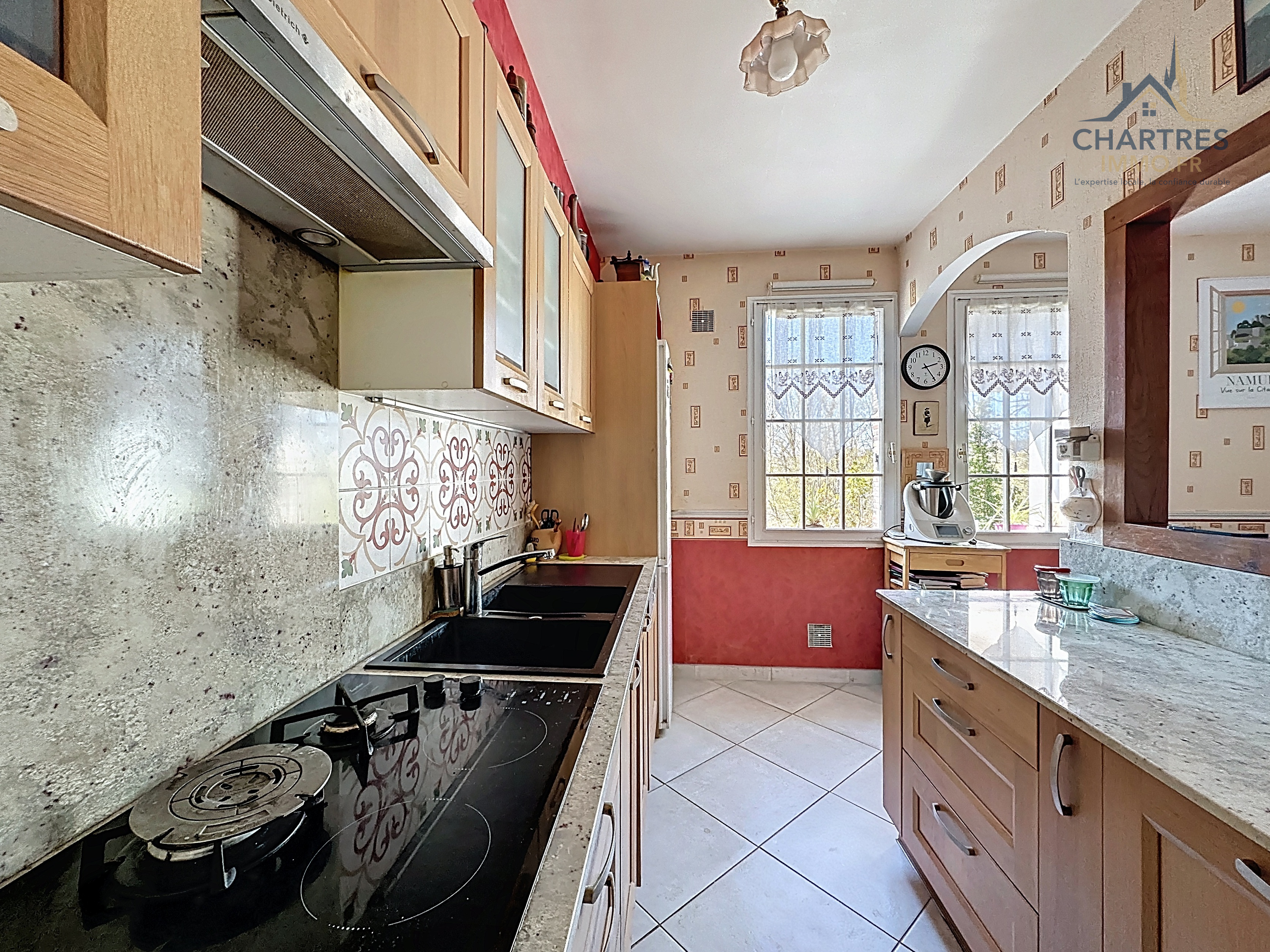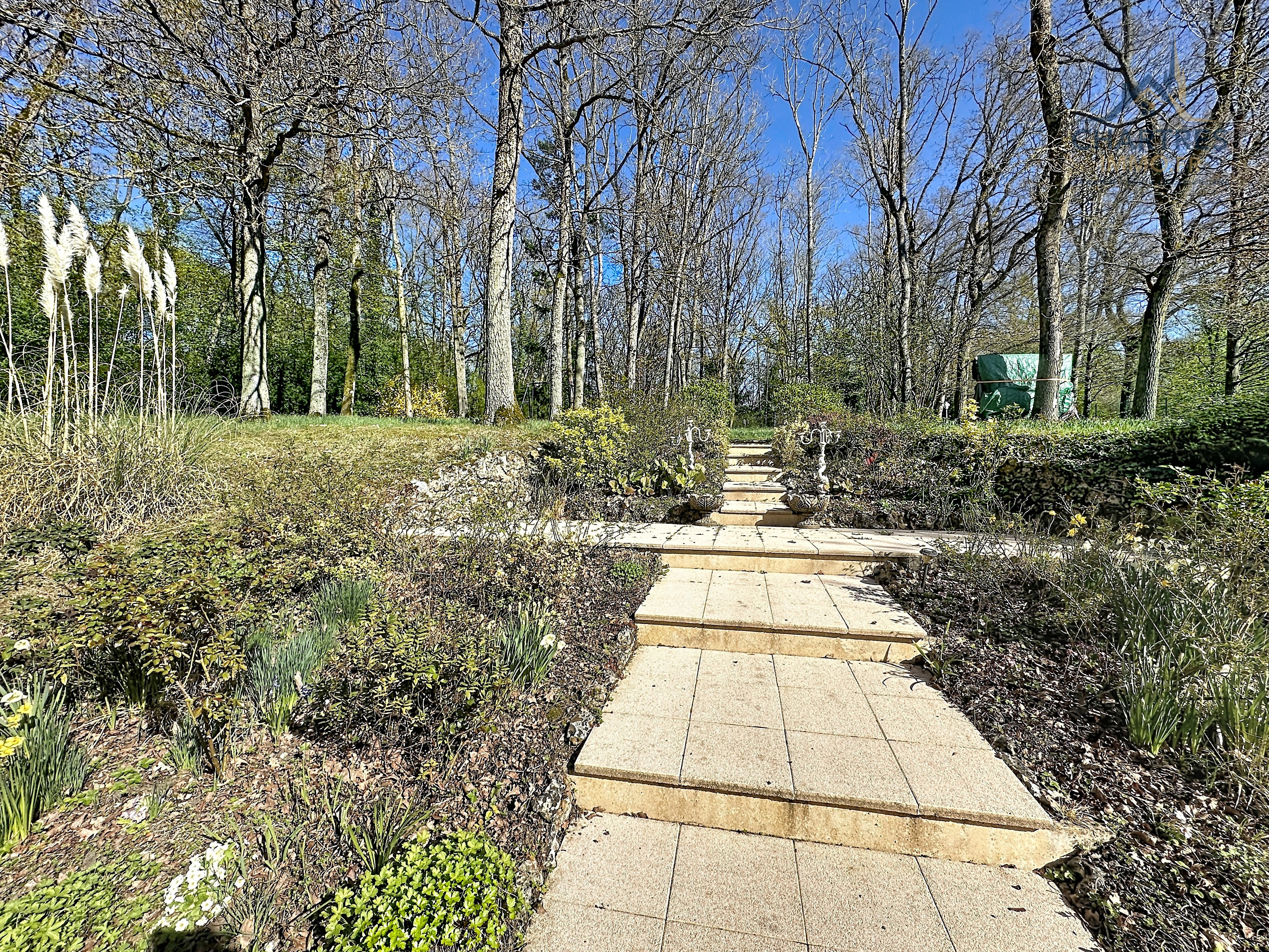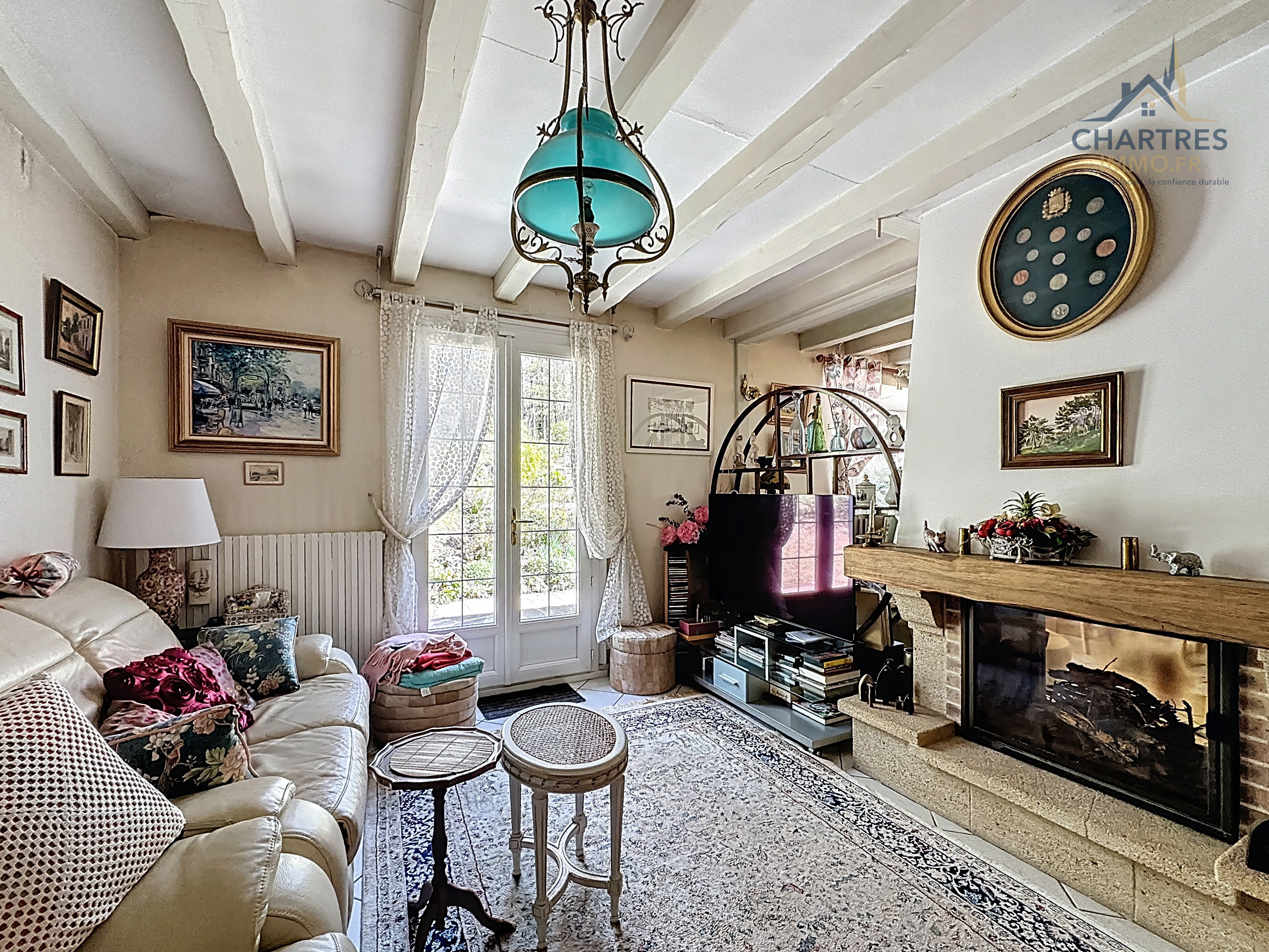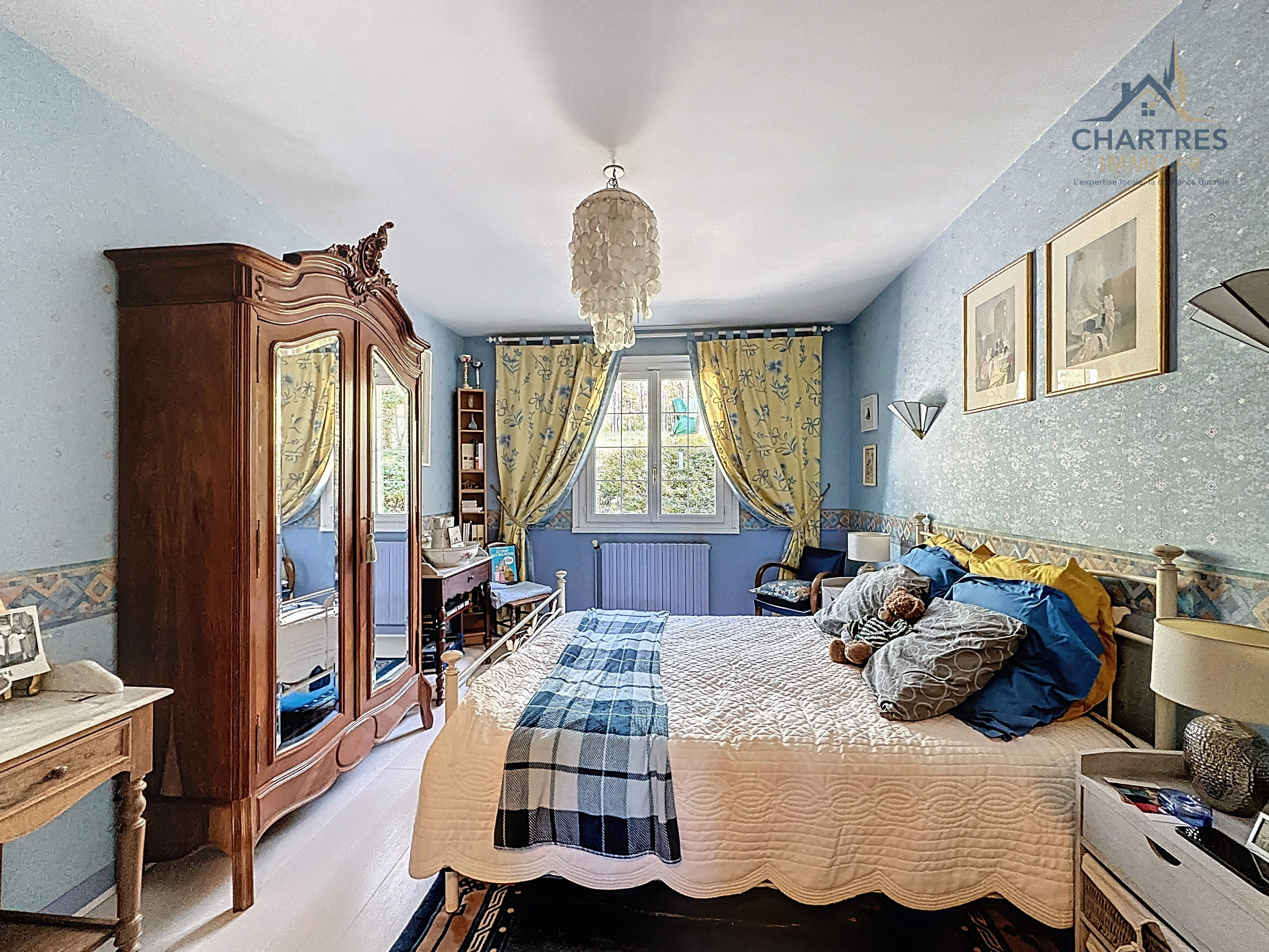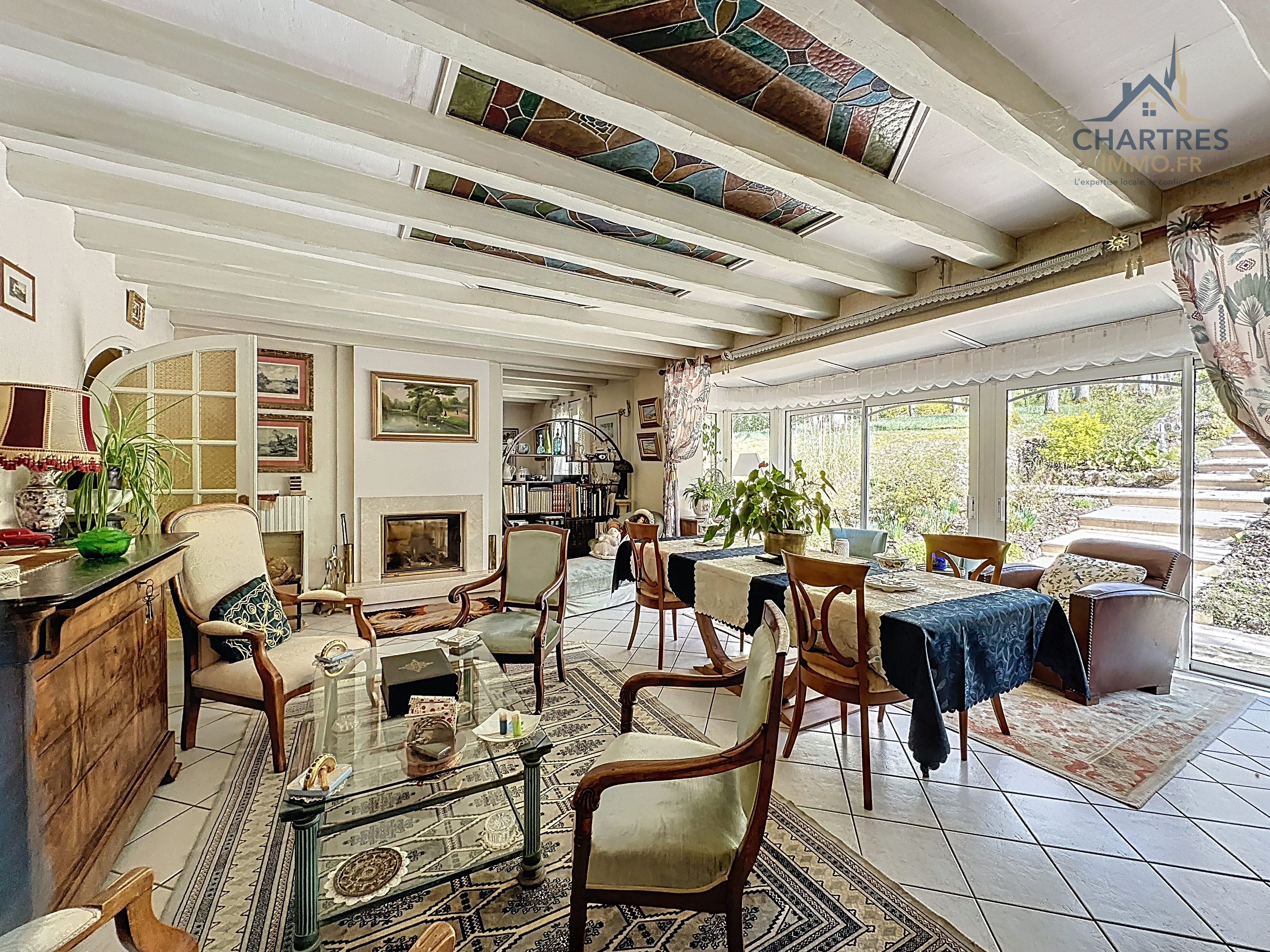 À l’extérieur, le terrain clos, arboré et boisé de 2 700 m² change immédiatement la perception du lieu. Il apporte une respiration rare si près de la ville, renforce l’intimité et donne à cette maison avec grand terrain au calme près de Chartres une vraie dimension patrimoniale. Les deux terrasses prolongent naturellement la maison : l’une profite de la vue dominante, l’autre s’oriente vers la partie boisée pour des moments plus confidentiels.