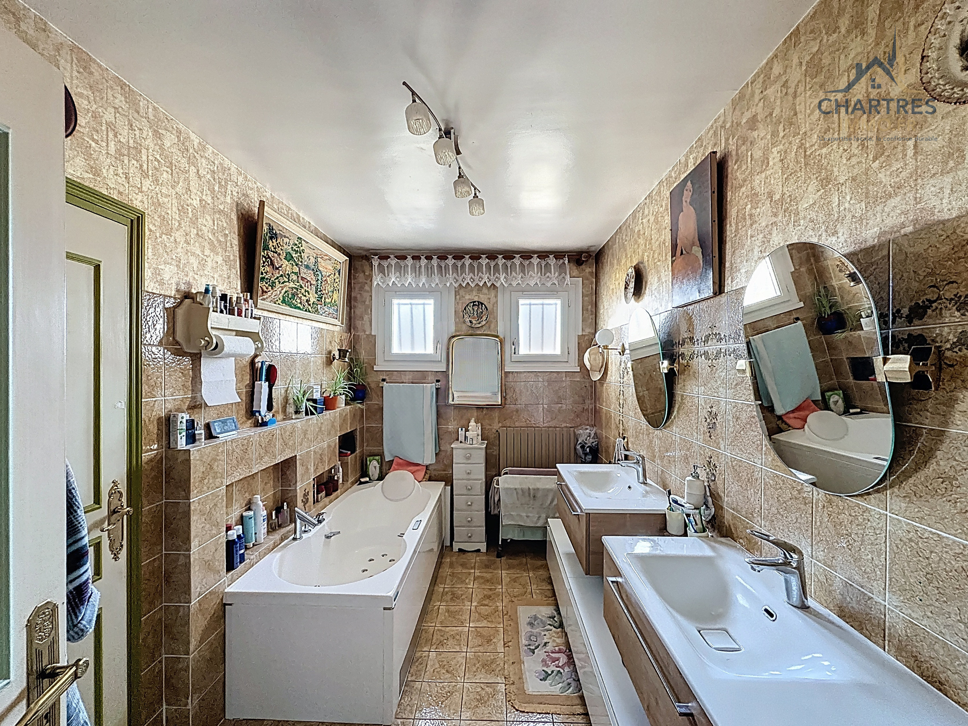 La salle de bain avec baignoire et doubles vasques, la salle d’eau supplémentaire avec WC ainsi qu’un second WC indépendant apportent un confort concret dans la vie quotidienne, en particulier pour une famille recherchant un bien pratique et rassurant sur le long terme.